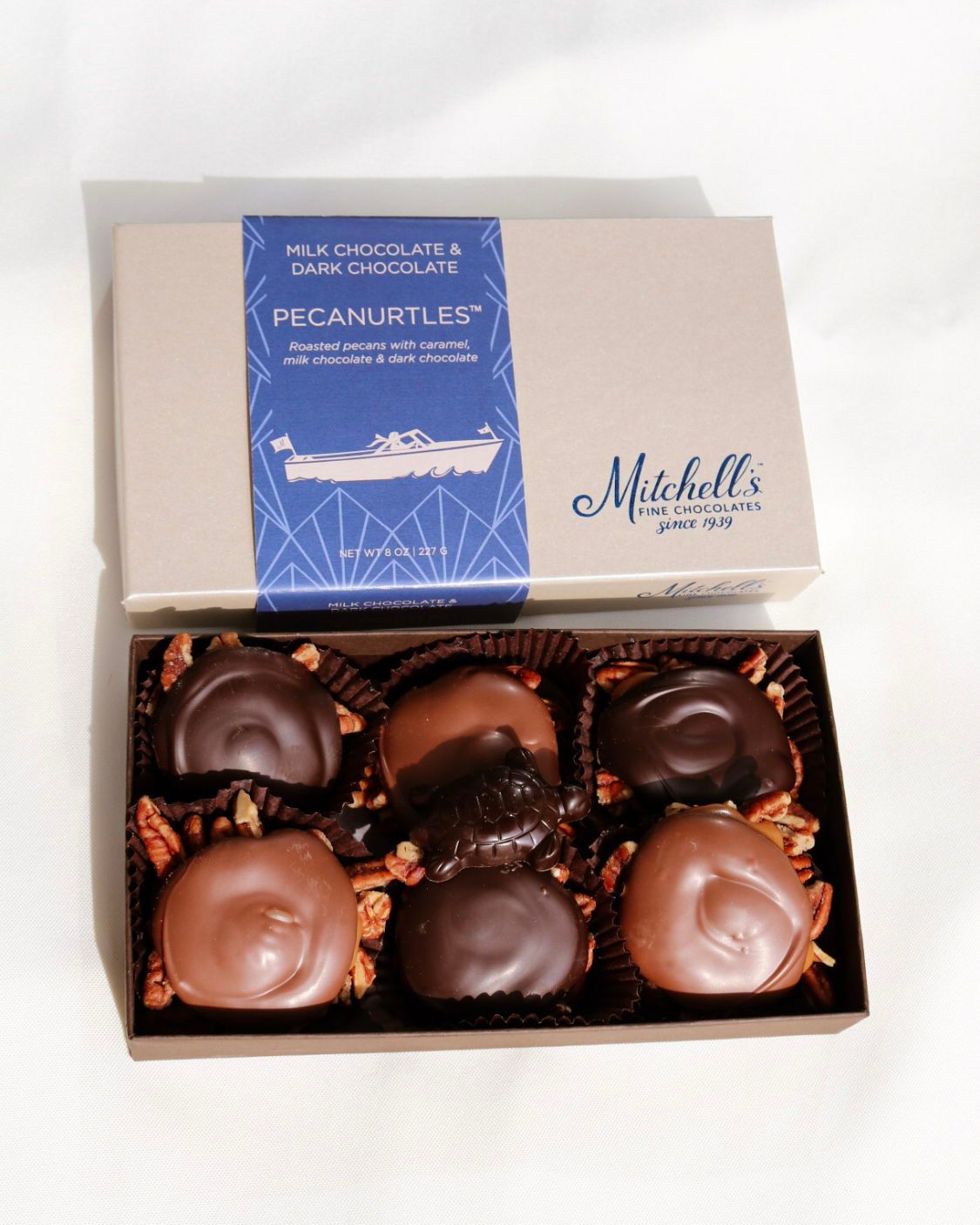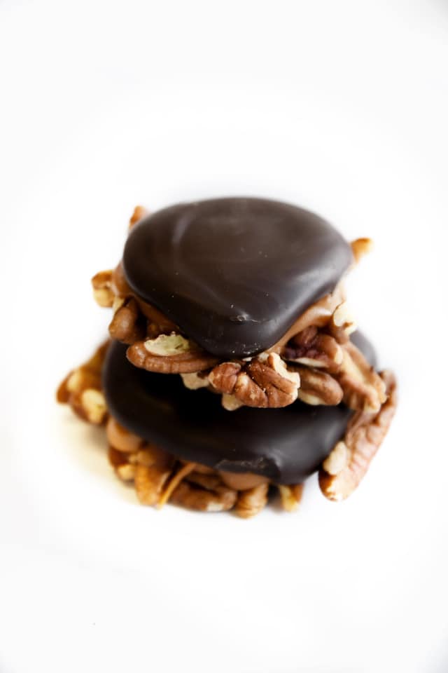 Homemade creamy caramel, hand piped over a bed of dry roasted and salted pecans, then sealed with a topping of chocolate.